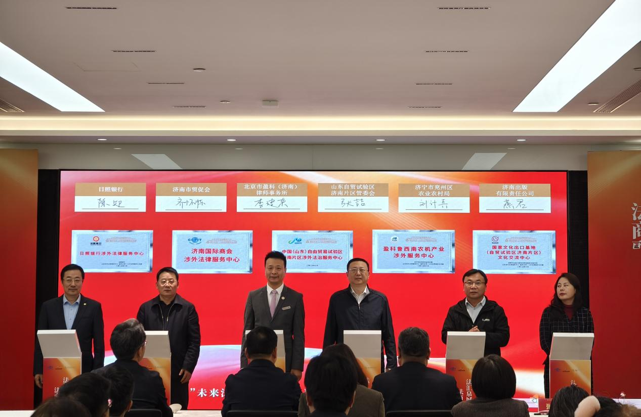 活动中,北京市盈科(济南)律师事务所与自贸试验区济南片区管委会、济南出版有限责任公司等五家单位签订合作协议。自贸试验区济南片区管委会常务副主任张喆等共同为中国(山东)自由贸易试验区济南片区涉外法治服务中心、国家文化出口基地(自贸试验区济南片区)文化交流中心揭牌。两个中心的设立,将有力提升济南片区对外开放能级,为片区企业提供一站式涉外法律服务,推动优秀文化 “走出去” 与海外文化 “引进来”,实现文化与贸易融合发展。